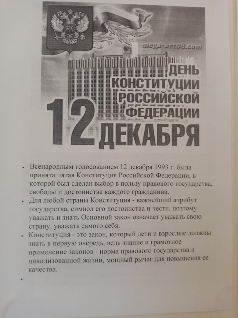 С 9-13 декабря в МБОУ СОШ с. Старые Камышлы проведены мероприятия посвященные ко Дню Конституции РФ. Классные руководители провели классные часы по темам: "Конституция - основной закон государства", "Конституция - это....", "День Конституции". Оформлен стенд ко Дню Конституции. Обучающиеся и учителя приняли активное участие в юридическом диктанте.